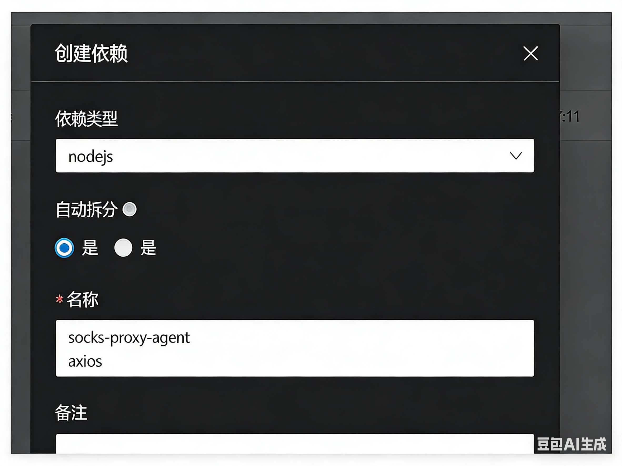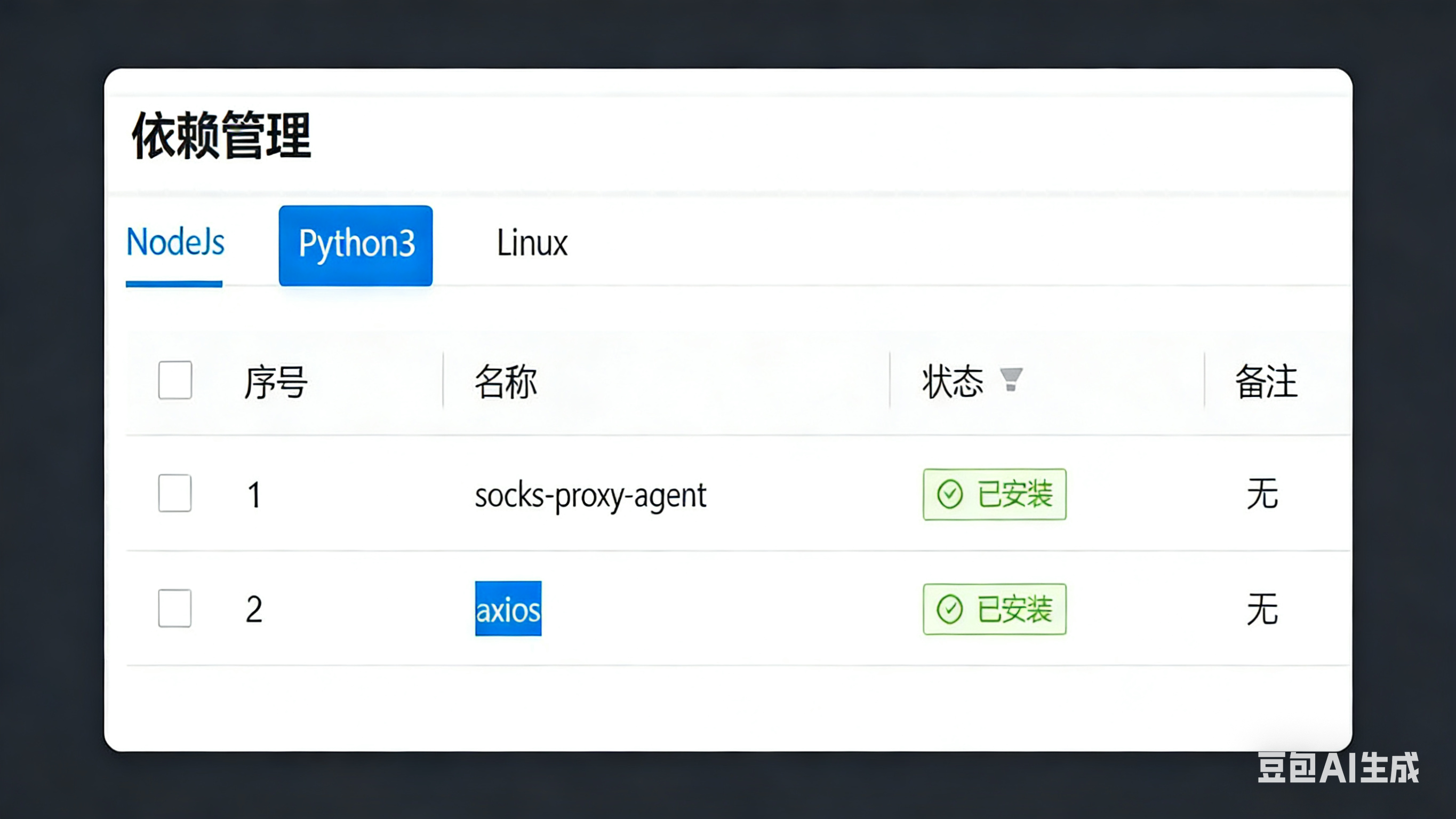 2、安装依赖,打开依赖管理,点击右上角创建依赖,如下图(手动安装完毕可以去脚本管理找到依赖安装运行安装其他依赖【此操作需执行上一步】)