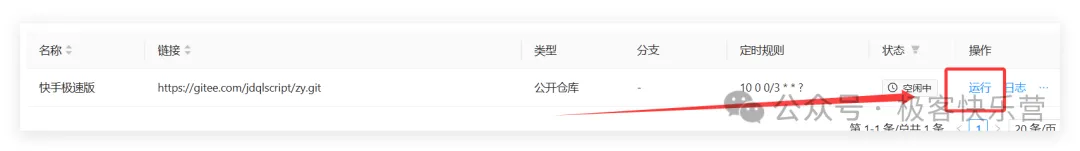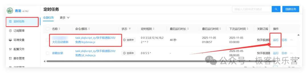 打开青龙面板定时任务,找到红框中的脚本,点击运行即可。