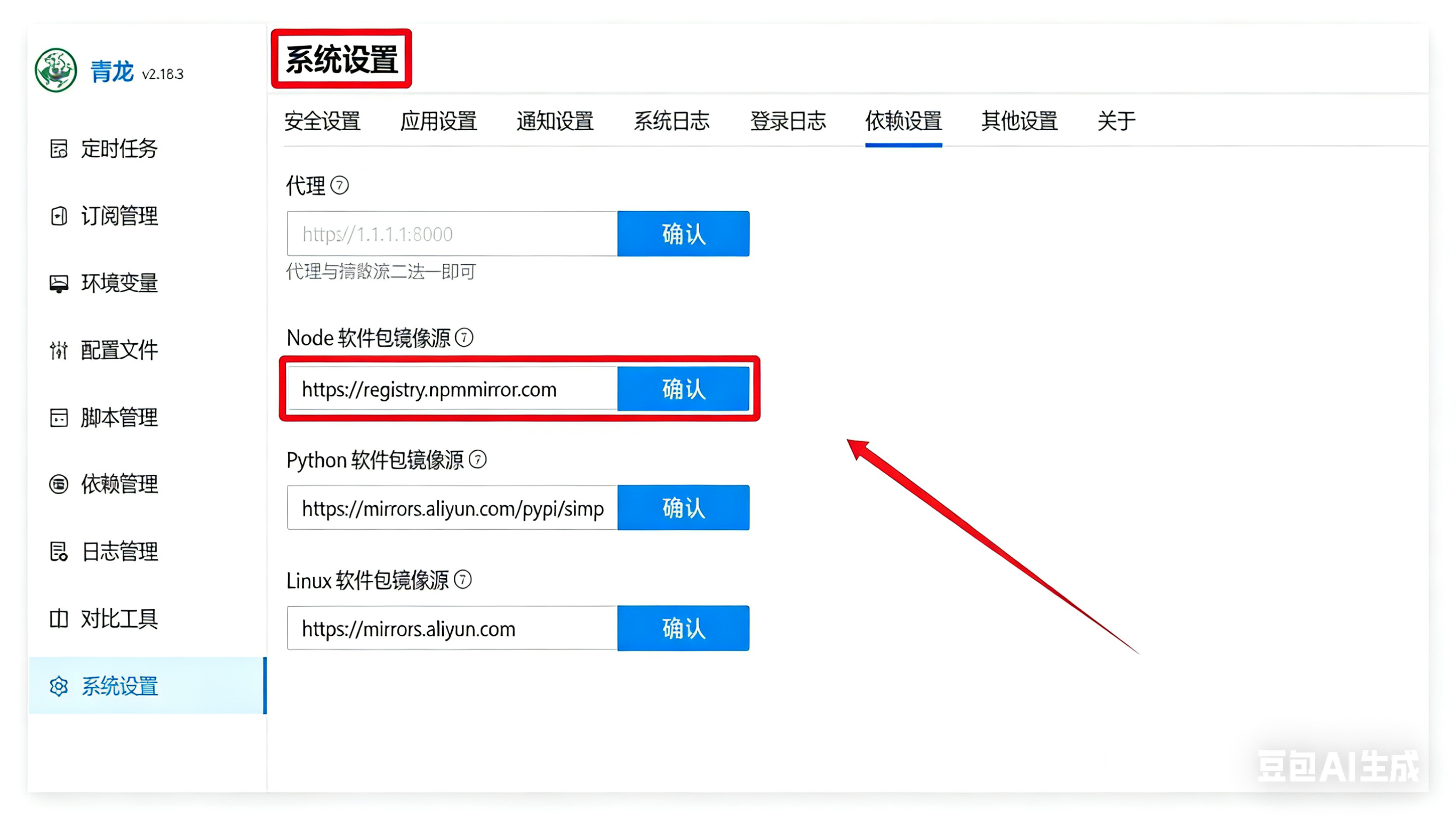 1、打开青龙面板,系统设置,依赖设置,填写镜像源